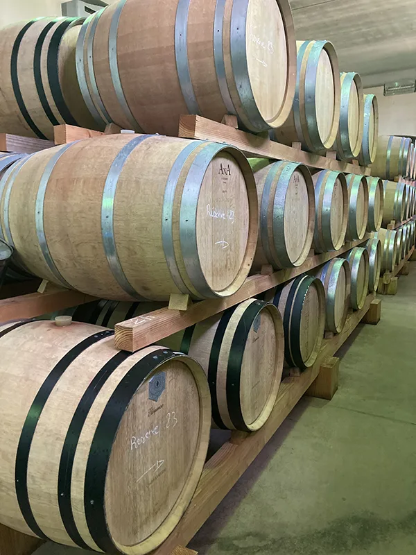 Een deel van de wijnen ondergaat houtlagering in eikenhouten vaten.