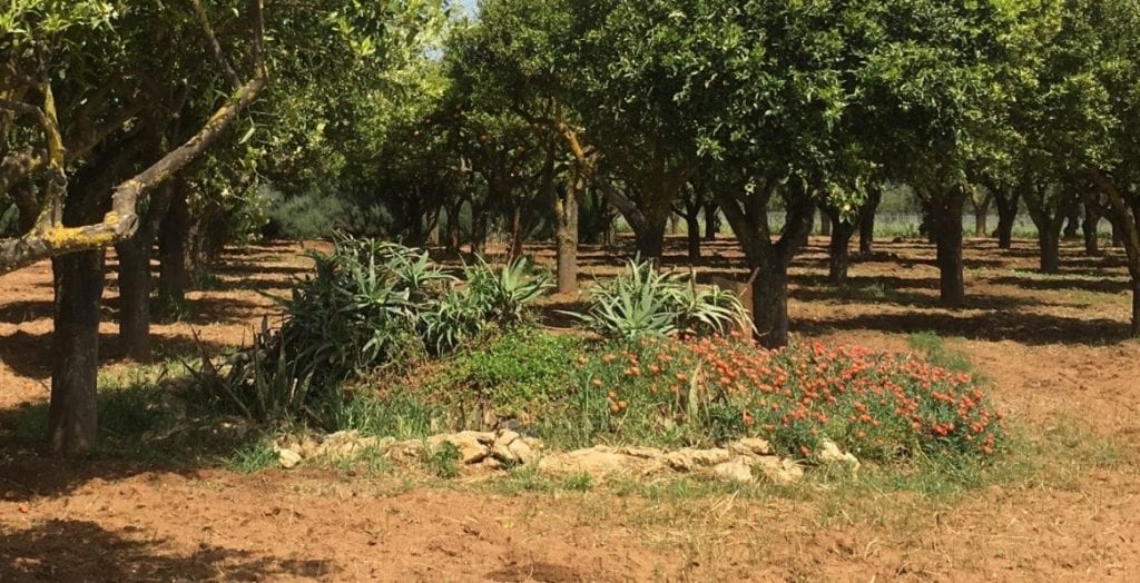Hier en daar zijn ook ecotuintjes aangelegd, tuintjes met bloemen en kruiden als tijm, rozemarijn, lavendel. In de wat grotere ecotuin staan ook fruitbomen, waaronder een granaatappelboom. Deze tuintjes dienen ervoor om insecten te lokken, want het is er voor insecten veel fijner vertoeven dan tussen de wijnranken. Mooi toch, hoe het vergroten van de biodiversiteit gelijk een probleem oplost.